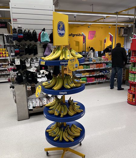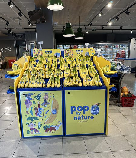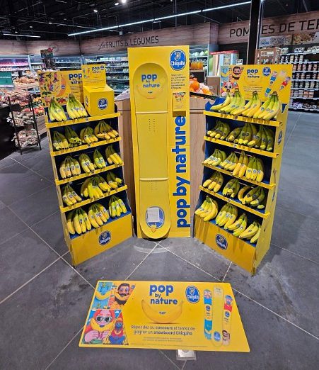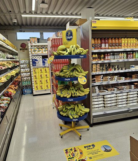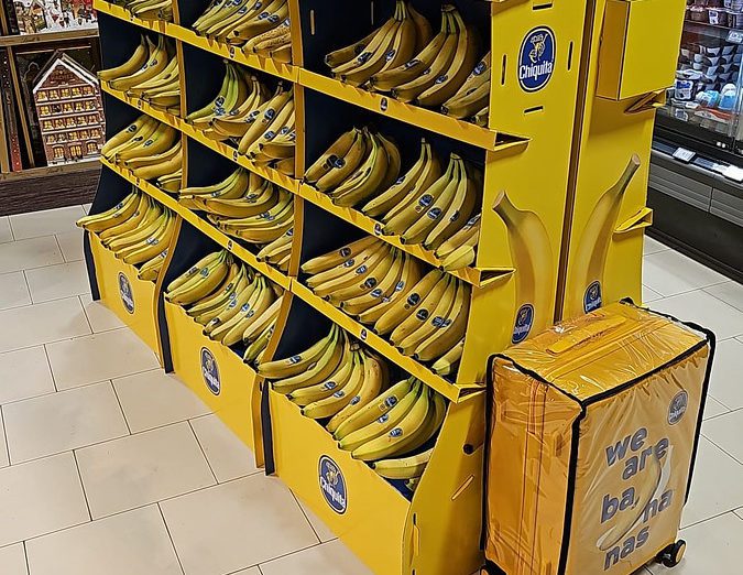 Das Chiquita Massendisplay ist eine permanente, stabile Displaylösung, die langfristige Sichtbarkeit und eine starke Regalwirkung sicherstellt. Ein integrierter Stauraum im Inneren des Displays ermöglicht die Lagerung zusätzlicher Bananenkartons, reduziert Wege ins Lager und steigert die Effizienz im Markt. Austauschbare Frontplakate und Topper sorgen dafür, dass das Display dauerhaft im Markt verbleiben kann und dennoch stets mit aktuellen Kampagnen übereinstimmt.